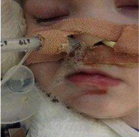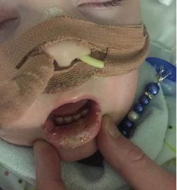 Il sondino da cui passa la ventilazione che aiuta Alfie a respirare, è completamente pregno di muco, fino ad entrargli praticamente in bocca.Da notare anche la lesione sotto al labbro inferiore.