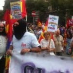Lanci di uova e fumogeni contro la sede di Unicredit in piazza Cordusio a Milano da parte dei manifestanti del centro sociale ‘Cantiere’ che sfilano quest’oggi insieme a Usb e Cobas per protestare contro la manovra del governo e la crisi economica.