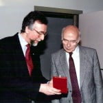 Foto: “Dicembre 1989: il direttore IOR, dott. Vincenzo Erroi, consegna la medaglia dell’Istituto al Prof. Renato Dulbecco”.
