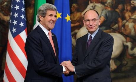 9 magg – Il presidente del Consiglio Enrico Letta ha ricevuto il segretario di Stato Usa John Kerry a Palazzo Chigi, per il primo incontro tra l’Amministrazione Obama e il nuovo governo italiano. Dopo le foto di rito, Kerry ha salutato i fotografi in italiano: “Buongiorno a tutti, grazie”. Siamo felici che siate venuti qui. C’é sempre stato un forte rapporto tra Italia e Stati Uniti”. Così il premier Enrico Letta ha salutato, in inglese, il segretario di Stato Usa John Kerry e la delegazione americana che lo accompagna, prima di cominciare i colloqui bilaterali a Palazzo Chigi