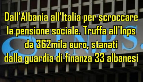 10 ottobre -Â (repubblica) Dall'Albania all'Italia per scroccare la pensione sociale. Truffa all'Inps da 362mila euro, stanati dalla guardia di finanza 33 albanesi che dichiaravano di risiedere in Italia per accaparrarsi qualche centinaia di euro al mese alle spalle dello stato italiano. I requisiti per ottenere quello che comunemente viene definito