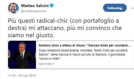 Ribatte ancora Salvini, stavolta però con un tono meno allarmato: “Più questi radical-chic (con portafoglio a destra) mi attaccano, più mi convinco che siamo nel giusto”. (askanews)