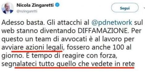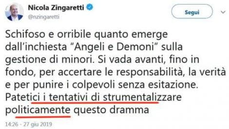 Solidali col sindaco e non con le vittime – – Ha scritto Zingaretti il 27 giugno: “Schifoso e orribile quanto emerge dall’inchiesta “Angeli e Demoni†sulla gestione di minori. Si vada avanti, fino in fondo, per accertare le responsabilità , la verità e per punire i colpevoli senza esitazione. Patetici i tentativi di strumentalizzare politicamente questo dramma“. Mai la parola Bibbiano. Mai la sigla Pd. Anzi, poi, solo minacce di querelare chiunque osi parlare di Bibbiano e del Pd. E perché il Pd di Bibbiano è solidale col sindaco Carletti, che è sotto accusa? Perché anche l’Anpi si è messa in mezzo a difesa dell’amministrazione? Nuovi partigiani? E perché, caro segretario del Pd, non si sente da sinistra una sola voce di solidarietà con le famiglie di quei bambini, con le vittime?