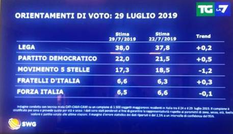 Continua la crescita della Lega nei sondaggi. Secondo l’ultima rilevazione di Swg per il Tg di La7 il Carroccio è salito al 38% guadagnando in una settimana lo 0.2%. Risale anche il Partito democratico al 22% (+0.5%).