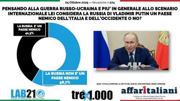 di Alberto Maggi (www.affaritaliani.it) – Il 58,7% degli italiani, la maggioranza netta, assoluta e ampia, considerando la guerra in Ucraina, non considera la Russia di Vladimir Putin un Paese nemico dell’Italia. La pensa diversamente solo il 41,3% del campione. Smentito clamorosamente il mainstream mediatico ed europeo tutto contro Mosca e il Cremlino e tutto a favore di Kiev e di Zelensky.