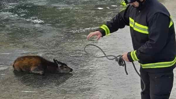 Tarvisio, vigili del fuoco salvano cervo intrappolato nel ghiaccio