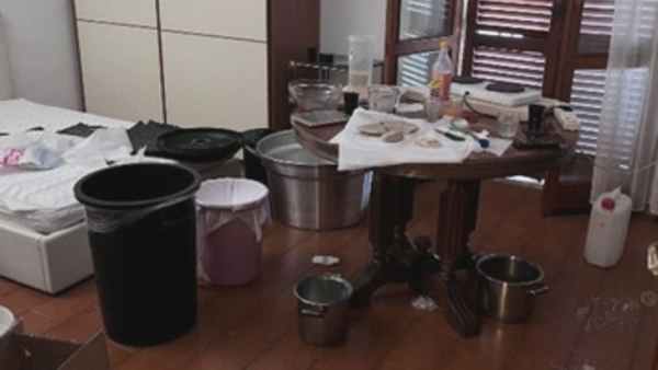 L’operazione ha consentito di scoprire il laboratorio all’interno di una stanza dell’abitazione dove sono sati trovati circa 7,4 chilogrammi di cocaina (fra quella già lavorata e quella ancora in pasta grezza), varie tipologie di solventi chimici e attrezzature utilizzate per la raffinazione della droga, una pressa idraulica per la realizzazione dei panetti da 1 chilo con impresso il logo B, e alcuni grossi recipienti in plastica contenenti una miscela di solvente e cocaina ancora in soluzione.