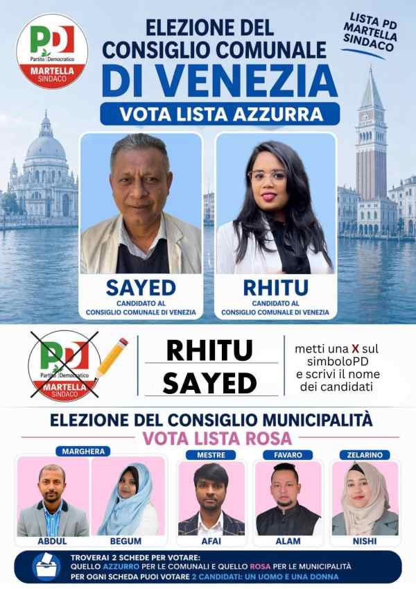 I candidati per il Pd sono Kamrul Syed e Rhitu Miah a Venezia, mentre per le municipalità di Mestre Carpenedo hanno candidato Ali Afay e Sumiya Begum, e a Chirignago Zelarino Tanzima Akter Nisha e per Favaro il candidato è Ali Hossain. “In nome di Allah, il Clemente, il Misericordioso. Pace a tutti voi Marghera – Venezia. Per le prossime elezioni del consiglio della municipalità , sono stati nominati due candidati del partito Pd per la comunità bengalese.