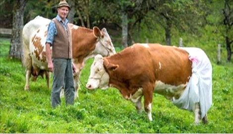 10 ottobre - Contro una nuova legge dell'Unione Europea, che prevede una multa per chi abbandoni letame e fertilizzanti sui terreni con una pendenza di oltre il 15%, l'allevatore tedesco Johann Huber ha messo in atto una protesta decisamente singolare. Ecco infatti una delle sue mucche, Doris, "premunirsi" contro la